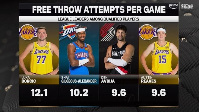 场均罚球榜东契奇12.1次霸榜,亚历山大紧随其后,阿夫迪亚与里夫斯并列第三