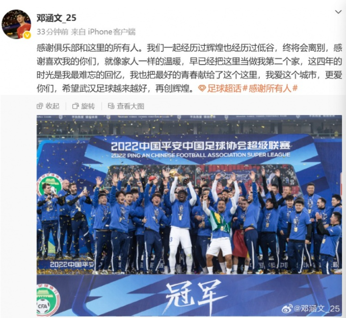 难说再见!邓涵文告别武汉三镇:这四年是我最难忘的时光