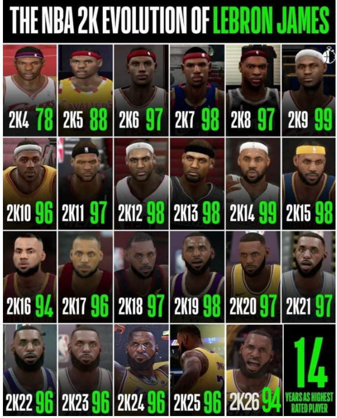 詹姆斯生涯2K值演化:新秀78→两次99封神,14次联盟最高写就GOAT轨迹