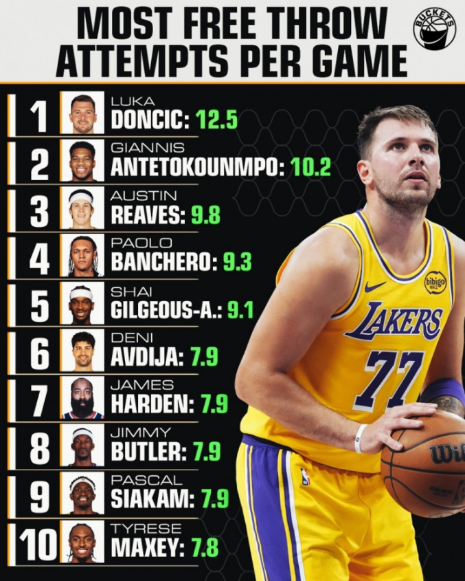 赛季至今罚球榜:东契奇场均12.5次登顶 里夫斯9.8次第3 SGA9.1次第5