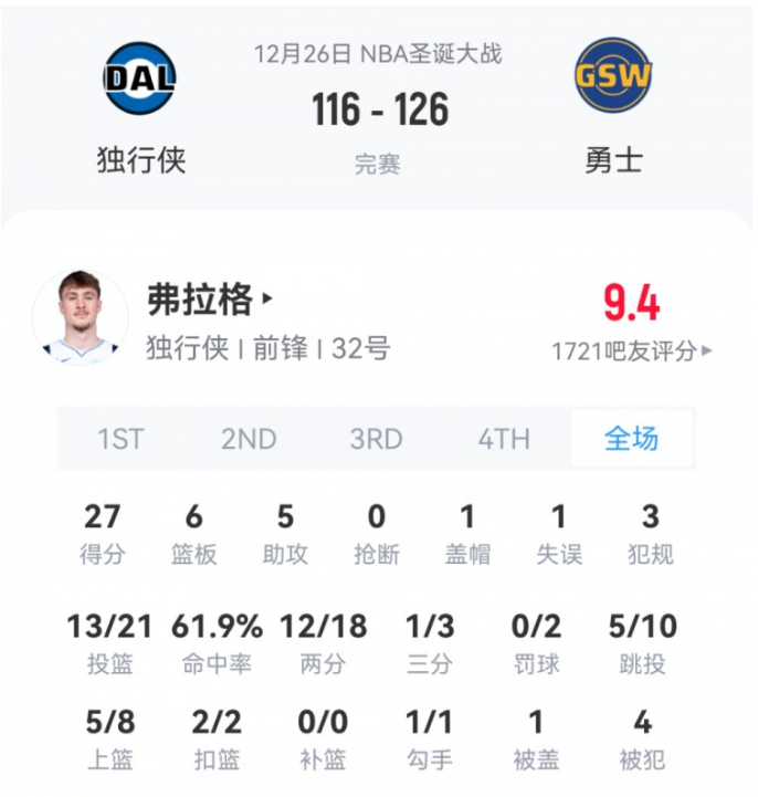 弗拉格圣诞大战27+6+5闪耀 哈珀20分钟12+3+2助菜鸟闪耀
